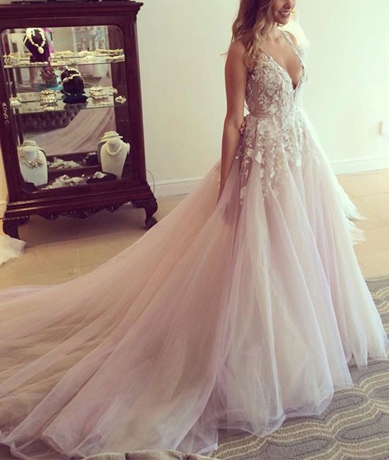 Deep V-Neck Blush Pink Wedding Dresses Floral Lace Appliques Boho Wedding Gowns with Open Back Affordable Bridal Dress