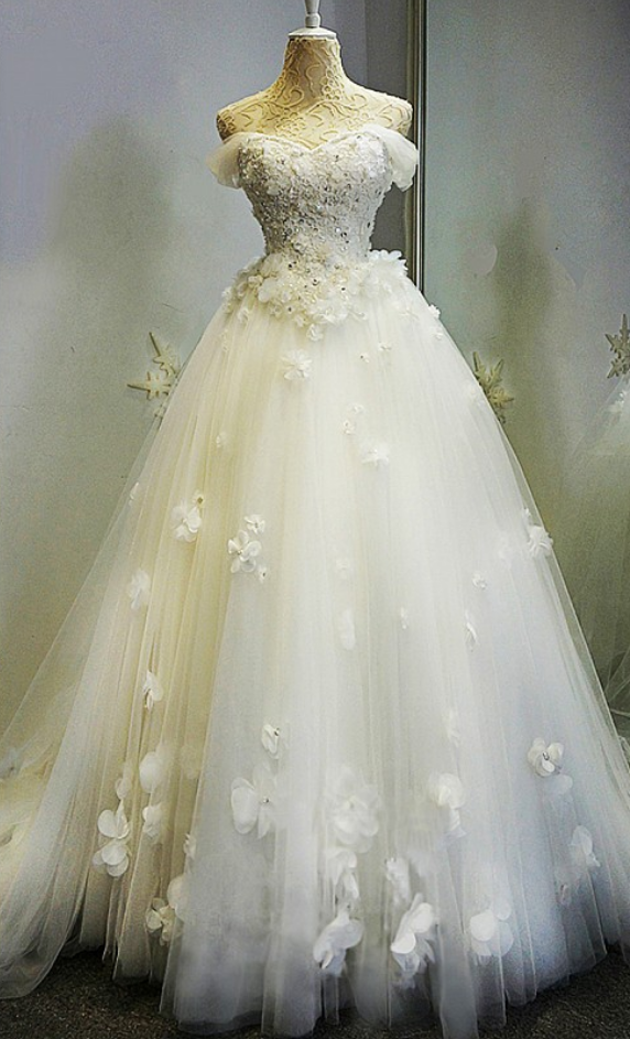 3D-Floral Appliques Wedding Dresses Sweetheart Chapel Train Sequins Beaded Open Back Pleats Beaded Wedding Dress Bridal Gown