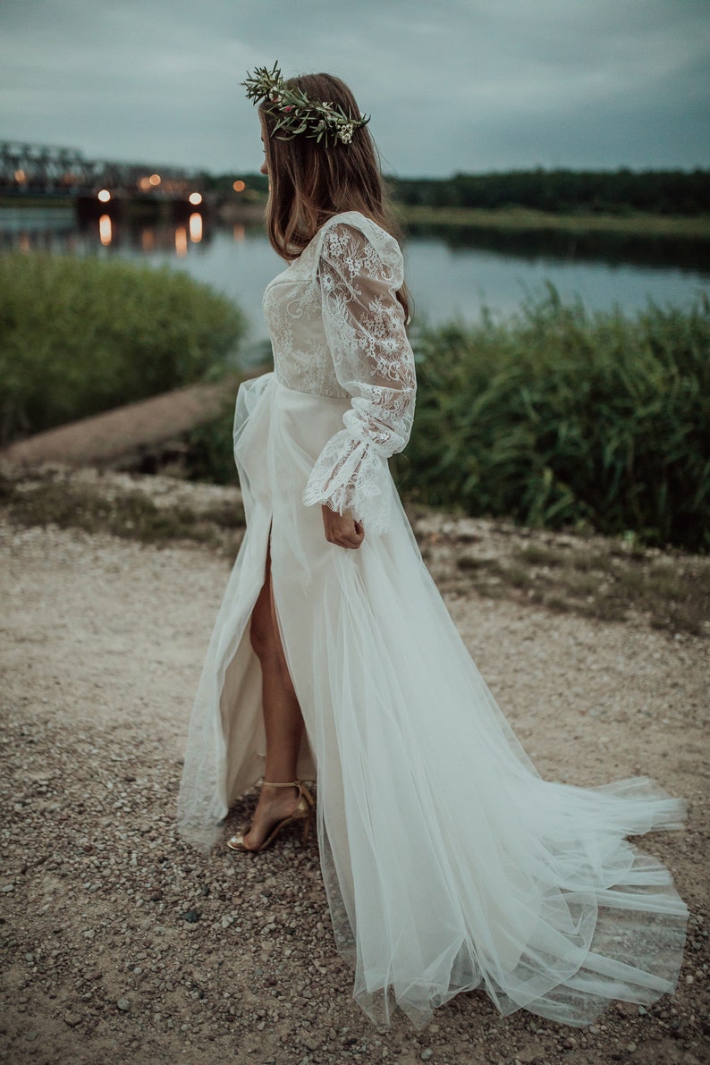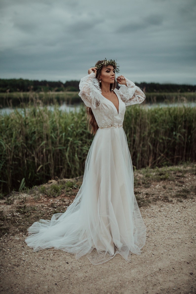 Long Sleeve Lace Wedding Dresses, Colored Bridal Gowns, Champagne Wedding Dress