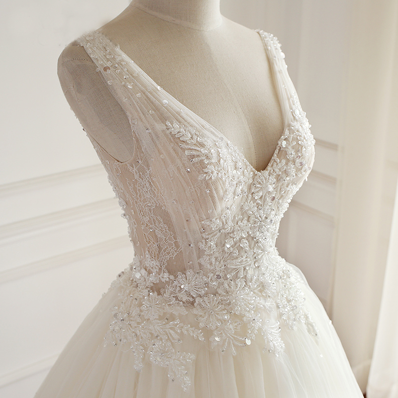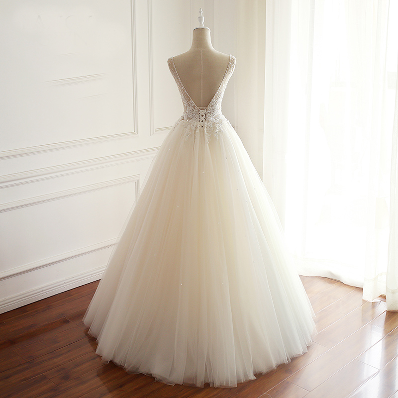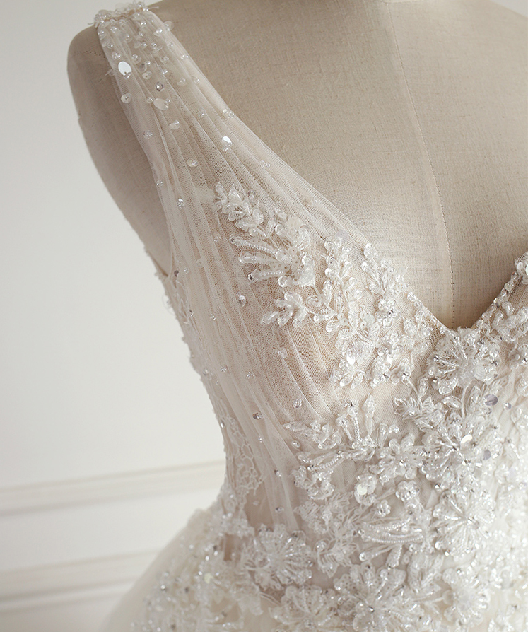 Ball Gown Wedding Dresses with Beaded Lace Appliques, White Bride Dresses, Long Wedding Gown