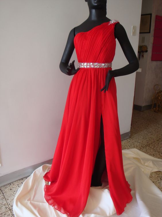 One Shoulder Red Prom Dresses, Long Formal Dresses with Rhinestones, Beaded Party Dresses