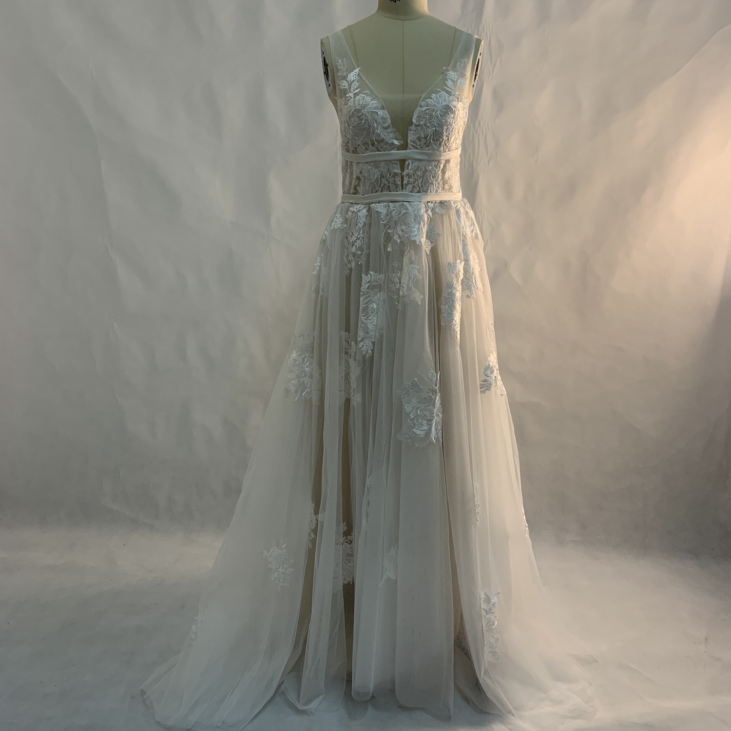 V-neck Champagne Wedding Dresses with Lace Appliques