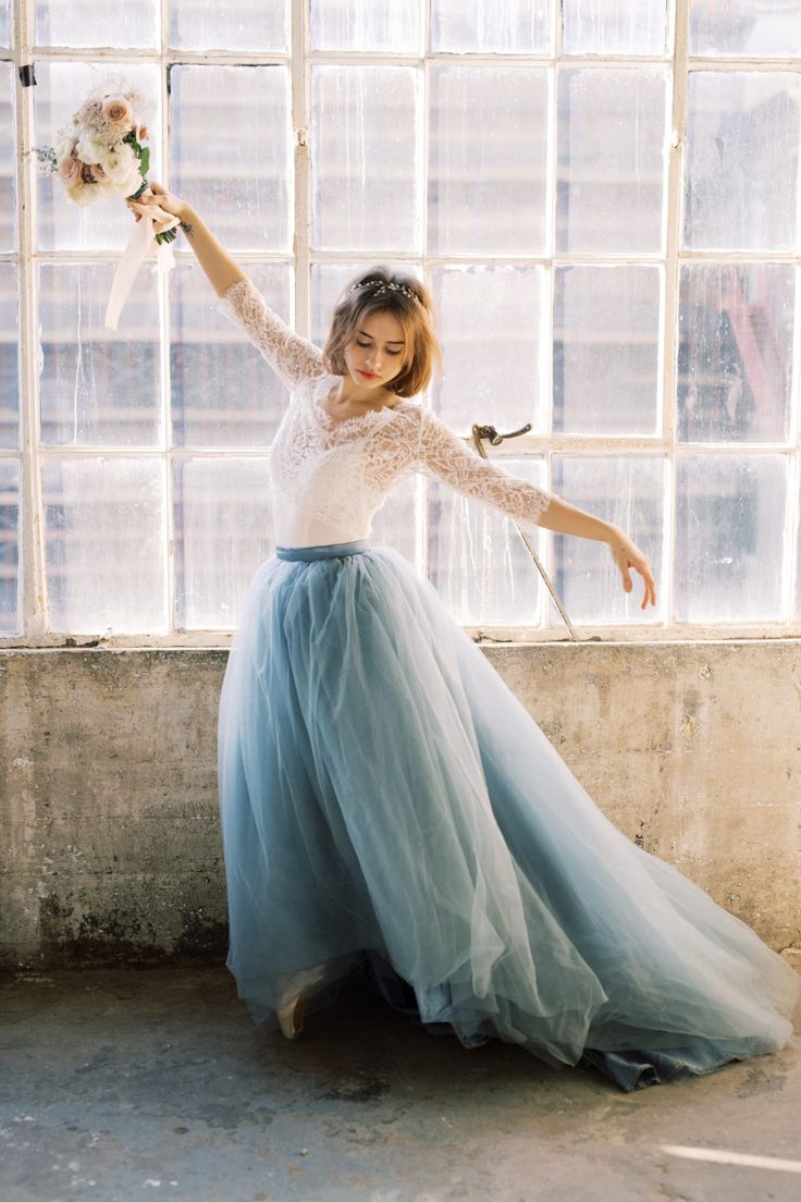 White and Dusty Blue Wedding Dresses, Long Bridal Dresses, Two-tone Bride Gown
